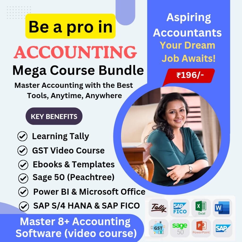 The bundle includes comprehensive courses on essential accounting software like Tally Prime, SAP, Microsoft Excel, Power BI, and more, along with valuable e-books and resources.
